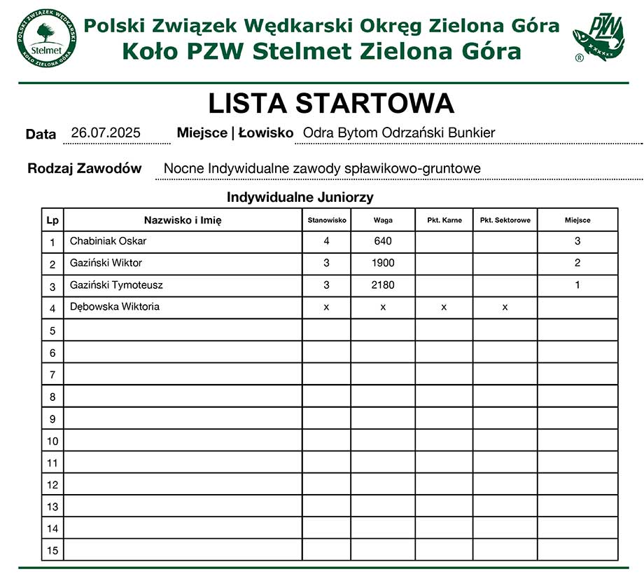 Zawody Spławikowe o Mistrzostwo Koła PZW Żółkiewka dnia 26 kwietnia 2026 r.